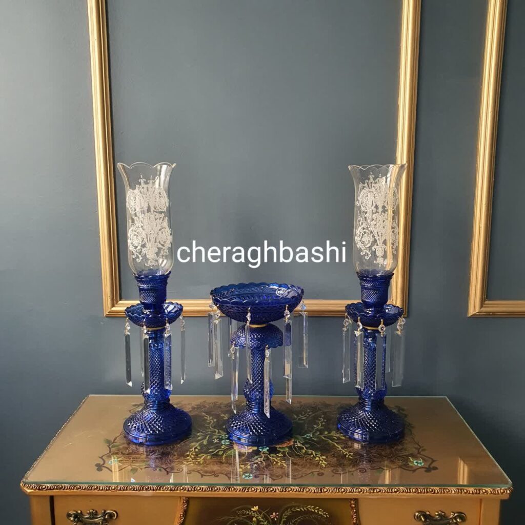 ست سه تیکه شمعدان با لاله و لاستر باکارات رنگ آبی