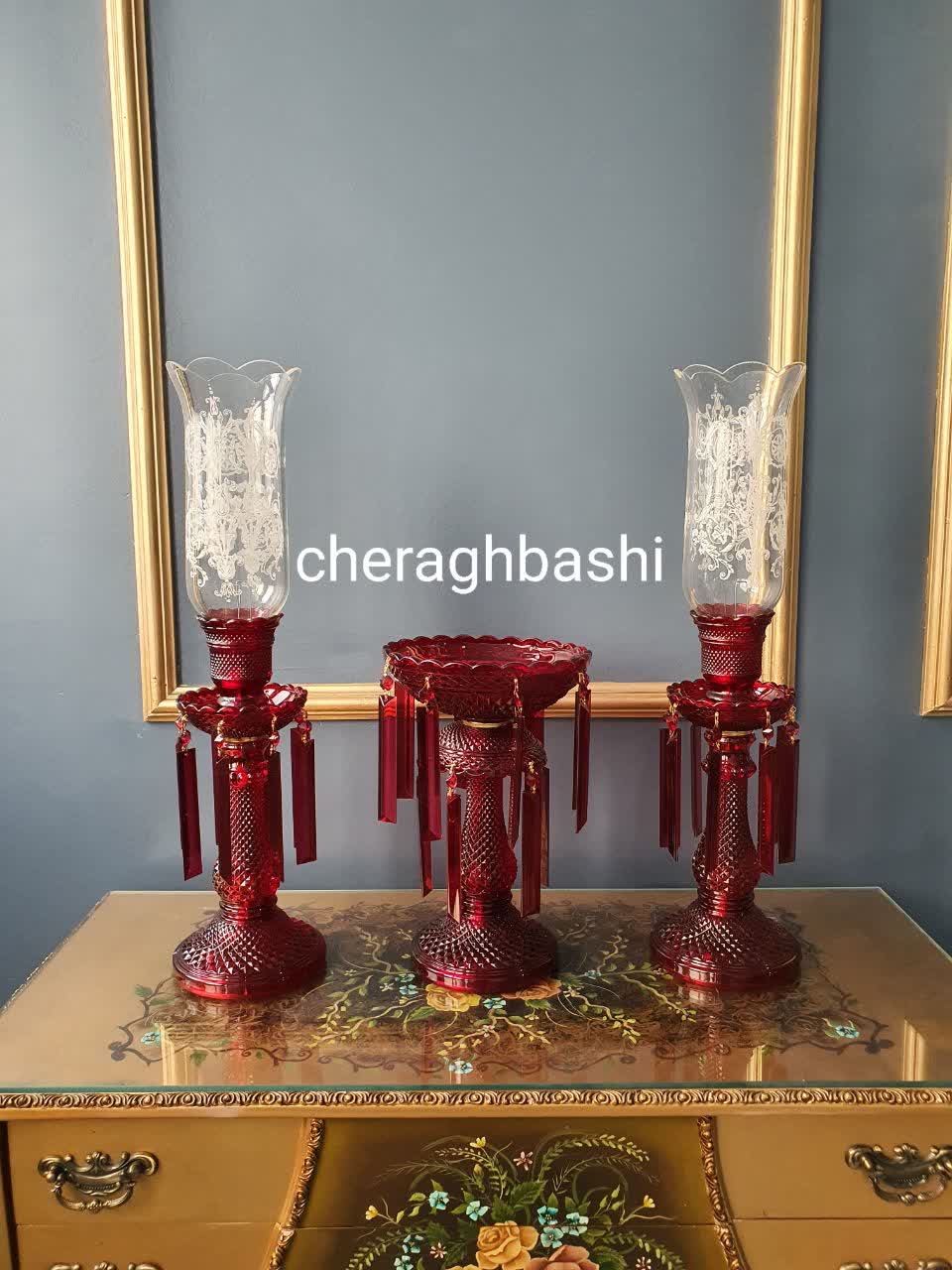 ست سه تیکه شمعدان با لاله و لاستر باکارات رنگ قرمز